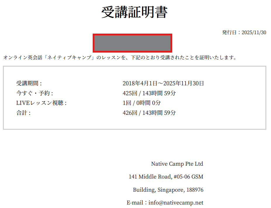 (※参考)下記が私Teyのネイティブキャンプの受講証明書です。