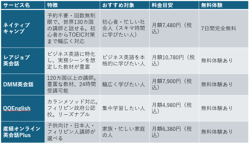 主要オンライン英会話の比較表